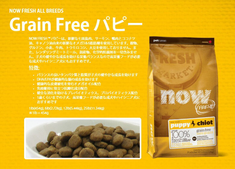 ▼ 商品詳細 ▼ 特徴 NOW FRESHパピーは、新鮮な七面鳥肉、サーモン、 鴨肉とココナツ油、キャノラ油由来の新鮮な オメガ3&6脂肪酸を使用しています。