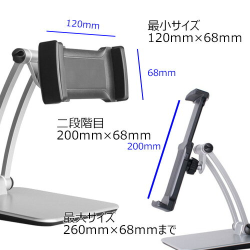 【商品仕様】 ・対応機種:4インチから12・9インチまで ・本体重量:台座部分 650g ホルダー部分 120g ・サイズ :台座部分 160mm×160mm×15mm ホルダー部分 約68mm×120mm(最小時) 約 260mm(最大時) ・製品保証:3ヶ月 ・製 造 :中国